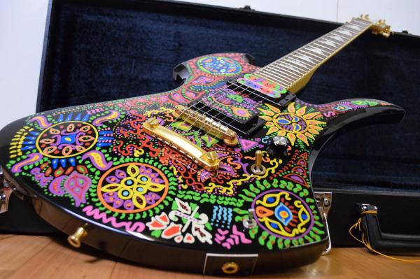 モンキーポッド、ペイズリー、アメーバ、ペイント、サイケなど、さまざまな愛称がある本機は、ジミー・ヘンドリックスのサイケペイントフライングVやジョージ・ハリスンのサイケペイントストラトキャスターなど、海外の伝説的なアーティストと並ぶその独特な世界観を堪能することができる一本であり、ヘッド裏には氏のサインが施されている点も見逃せません。