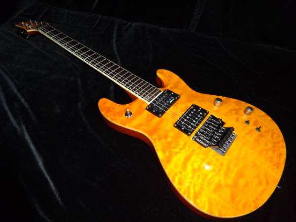 容姿はダブルカッタウェイで、ゴージャスな見た目のキルテッドメイプル。指板材はローズウッドで、ボディをぐっと引き締めるブラックカラーです。