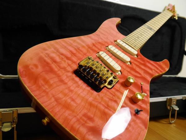 特徴はキルトメイプルを使用したシースルーピンクの美しいボディ。ネックにはカーリーメイプルを使用し、綺麗な木目が現れています。