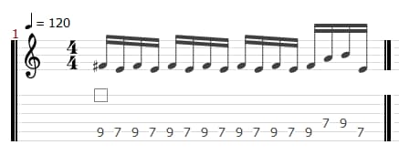 スイッチング奏法の練習は、冒頭で紹介した動画のフレーズを参考にしたパターンから始めるのがよいでしょう。基本は16分音符となっており、ネックを持つ手でハンマリングとプリングを駆使して音を出します。