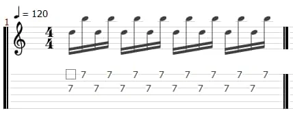 例えば、画像のように弦同士が離れたフレーズは、オルタネイトピッキングよりもハイブリッドピッキングのほうが弾きやすい傾向があります。