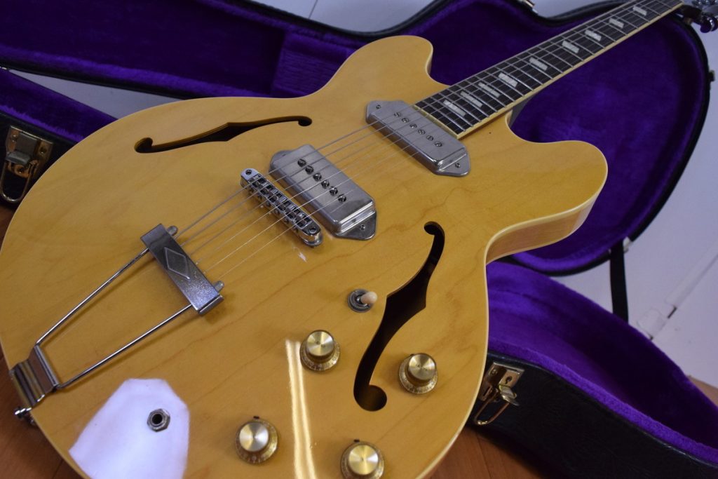 東京都練馬区のお客様より、お電話にてお問い合わせいただき、Epiphone/エピフォン Elite 1965 Casino Natural カジノ セミアコの査定に伺いました。全体的にスレ傷や打痕、金属部のくすみ等は見受けられ、使用感・経年感の多少ある外観、ネックはやや順反り状態で、12フレット上での弦高は、6弦側:約2.0mm、1弦側:約1.5mmでした。ナット幅は約42mmです。フレットは約7~8分山残りで、全体的にくすみは見受けられますが、部分減りは少ない印象で、通常の強さのピッキングでは、ビビリ・音詰まりはなく、アンプからの音出しも問題ございませんでしたので、本体、ハードケースのお引取りをさせていただきました。とてもスムーズにご売却できて、助かったとおっしゃっていただけました!この度は楽器の買取屋さんにご依頼いただき、ありがとうございました!