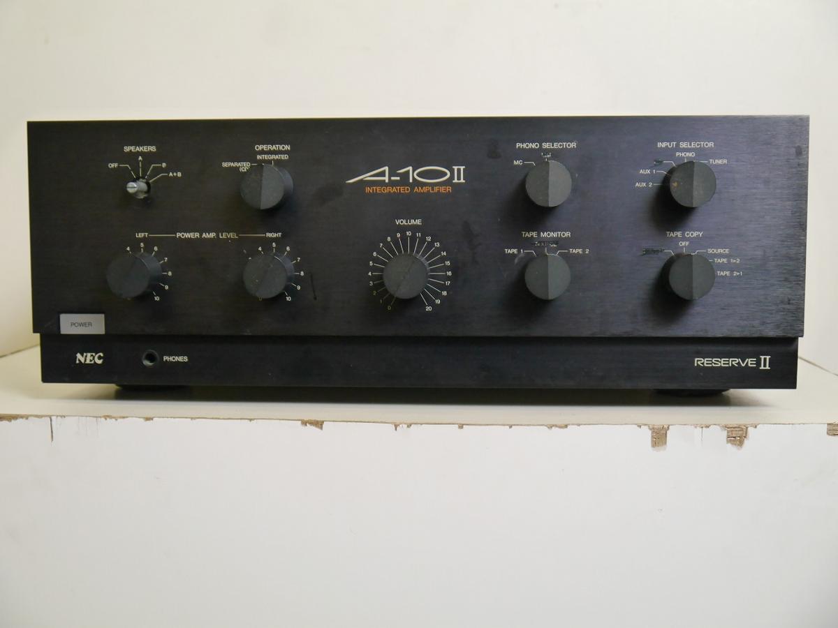 奈良県天理市のお客様より、宅配買取にてNEC プリメインアンプ A-10Ⅱのお買取をさせていただきました。キズ・汚れ等、使用感・経年感の見受けられる外観で、通電・音出し・基本動作確認をしたところ、POWERランプ光らない、SPEAKERSつまみが外れている、全体的にガリがあるなどのジャンク品でしたが、本体のお引き取りをさせていただきました。オーディオの買取屋さんなら、ジャンク品であっても全国から送料無料、高額査定にてお買取りしております。NEC プリメインアンプ A-10Ⅱのご売却をお考えなら、ぜひオーディオの買取屋さんにおまかせください!